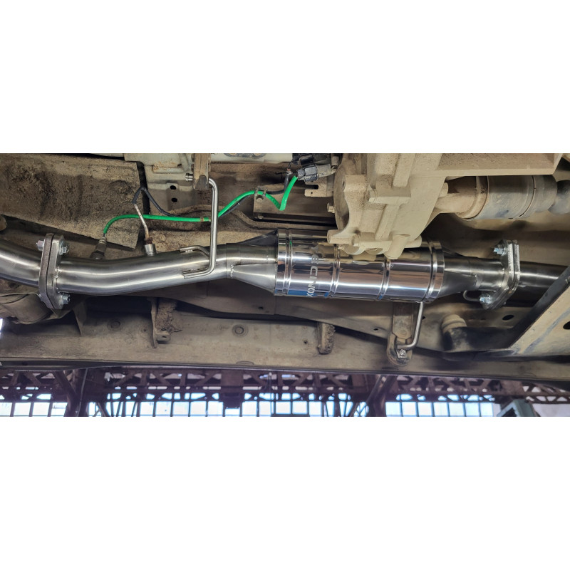 Supprime le fap (filtre à particules). Se situe après le catalyseur primaire et le catalyseur secondaire. Pourvu d'un pot de détente afin de recréer de la contre-pression pour le turbo, il libère le moteur, améliore les performances, et garanti le parfait fonctionnement du turbo. Le pot de détente bénéficie d'une double peau en inox polie et de goussets de renfort aux extrémités, pour une parfaite finition et une durabilité sans faille. Reprend les emplacements de sonde d'origine pour un montage parfait. Construction 100% inox.