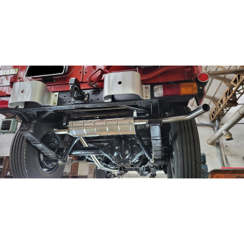 Spécialement conçu pour le FJ40 4.2L 6 cyl. essence (moteur 2F) des années 1975-1979. Contrairement au silencieux d'origine à chicanes (labyrinthe interne qui freine le flux des gaz), notre silencieux Sport est du type absorption (flux rectiligne des gaz, sans contraintes). Il permet une amélioration des performances et révèle la belle musicalité du 6 cylindres (qui reste très raisonnable). Il se raccorde après le tube intermédiaire, en lieu et place du silencieux d'origine dont il reprend le volume afin de ne pas dénaturer l'aspect visuel du véhicule. Construit 100% en inox 304L, il est livré avec son joint et la visserie.